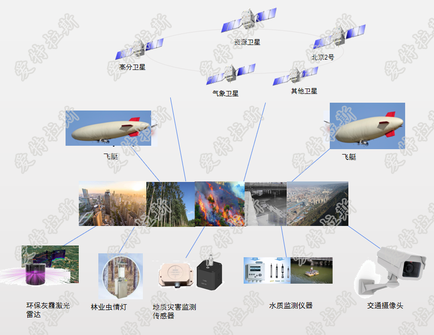 “地”是在地面采用多種監測手段,實(shí)現精細化的綜合監測。地基傳感器,通常用作連續性、長(cháng)時(shí)間監測,可以監測事件的發(fā)生前、發(fā)生中、發(fā)生后等一系列過(guò)程,例如交通攝像頭、智能交通樁;環(huán)保當中小型氣象站、大氣污染監測儀、3D激光雷達監測大氣狀況;林業(yè)當中利用紅外攝像機、蟲(chóng)情燈、無(wú)人機等監測火災和蟲(chóng)災狀況;地質(zhì)災害多發(fā)區域安裝GNSS設備、振動(dòng)傳感器、位移計、雨量計等實(shí)時(shí)監測地質(zhì)災害體狀況;水質(zhì)污染監測采用污染監測儀、斷面監測傳感器、PH計、流量計等監測全城水質(zhì)狀況,配合天基衛星,空基飛艇等全方位監測事件的動(dòng)態(tài)過(guò)程。