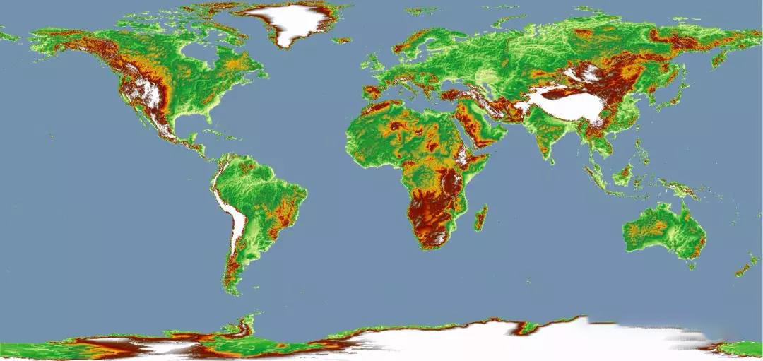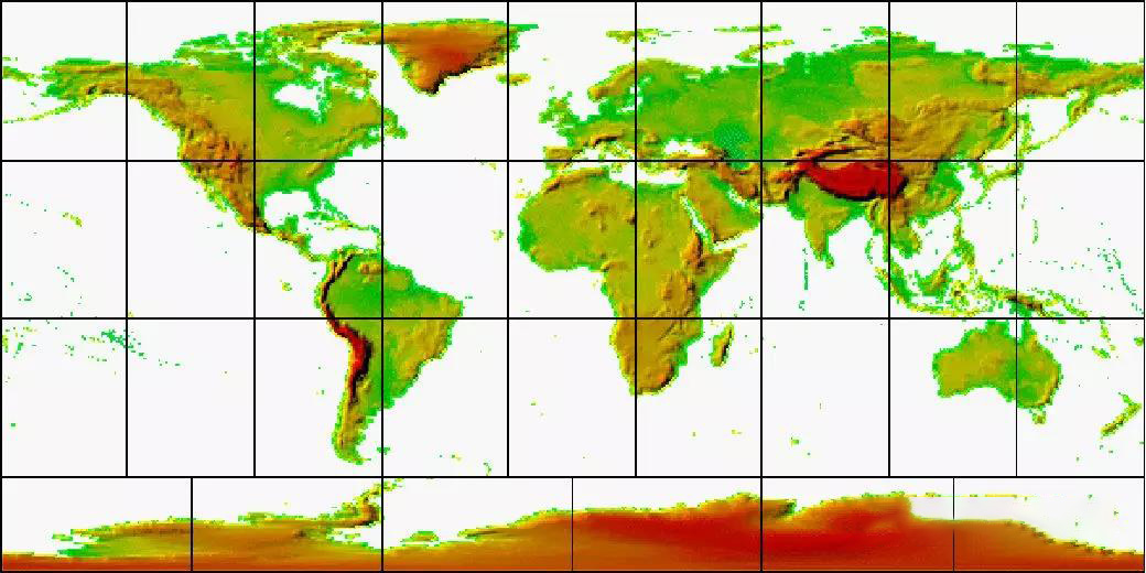 隨著(zhù)全球各領(lǐng)域研究對高分辨率DEM數據的需求不斷增強,同時(shí)新的高程數據獲取技術(shù)不斷涌現,USGS和NGA合作,十年磨一劍,于2010年共同推出了全球多分辨率地形高程數據(Global Multi-resolution Terrain Elevation Data,簡(jiǎn)稱(chēng)GMTED2010),在全球陸地區域提供30弧秒、15弧秒、7.5弧秒三種分辨率DEM數據。(在格陵蘭島和南極洲只提供30弧秒分辨率DEM數據,其他陸地區域均提供相當于1Km、500m、250m分辨率的DEM數據),下圖是GMTED2010全球30弧秒分辨率平均高程數據(-430/8625米)。