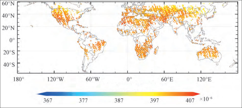 圖4 全球XCO2 數據時(shí)空尺度統合后的月均值