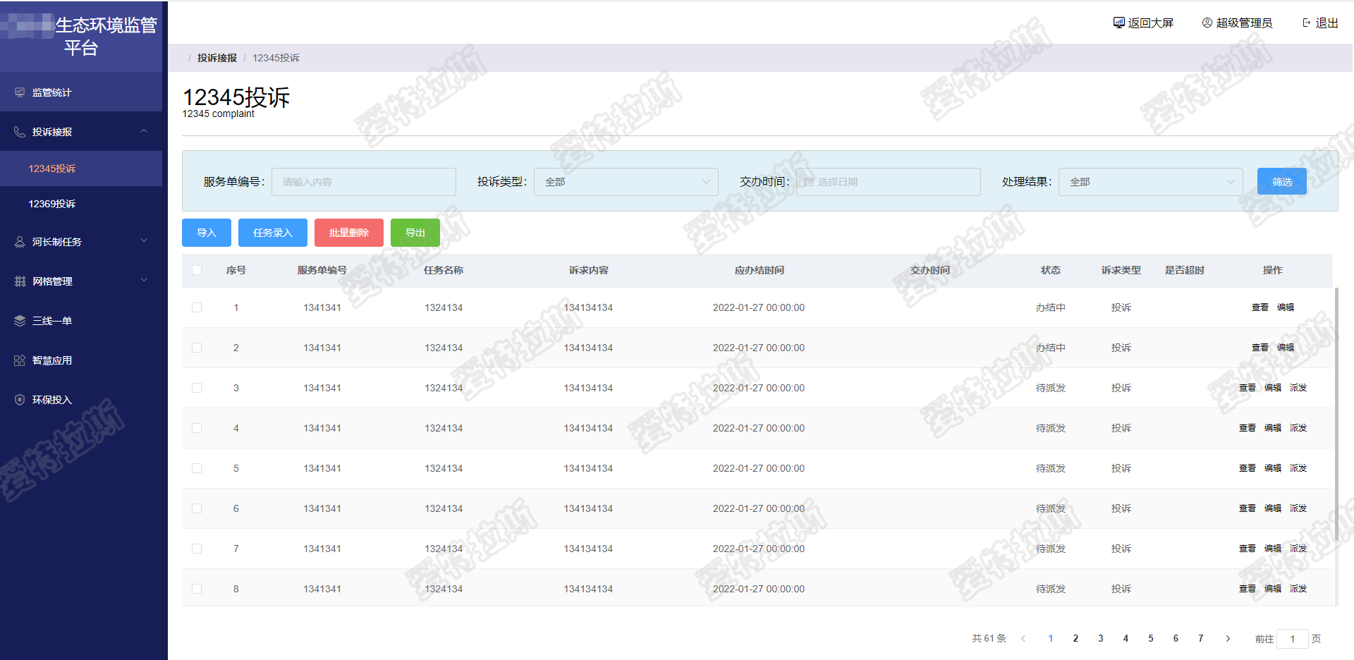 主要是對人員和任務(wù)進(jìn)行分配管理的這么一個(gè)系統。根據12345、12369、河長(cháng)、網(wǎng)格員的投訴或上報去進(jìn)行任務(wù)的管理,對于收錄的任務(wù)派發(fā)給當地的人員去進(jìn)行處理反饋。根據處理情況也會(huì )顯示在監管統計頁(yè)面中進(jìn)行可視化的統計展示,更夠更好的進(jìn)行分析匯總。河長(cháng)可以通過(guò)河長(cháng)地圖更好的去了解河流的走向和自身所管理的范圍。網(wǎng)格員可以通過(guò)網(wǎng)格信息去查看所屬網(wǎng)格目前現有的任務(wù)數量。